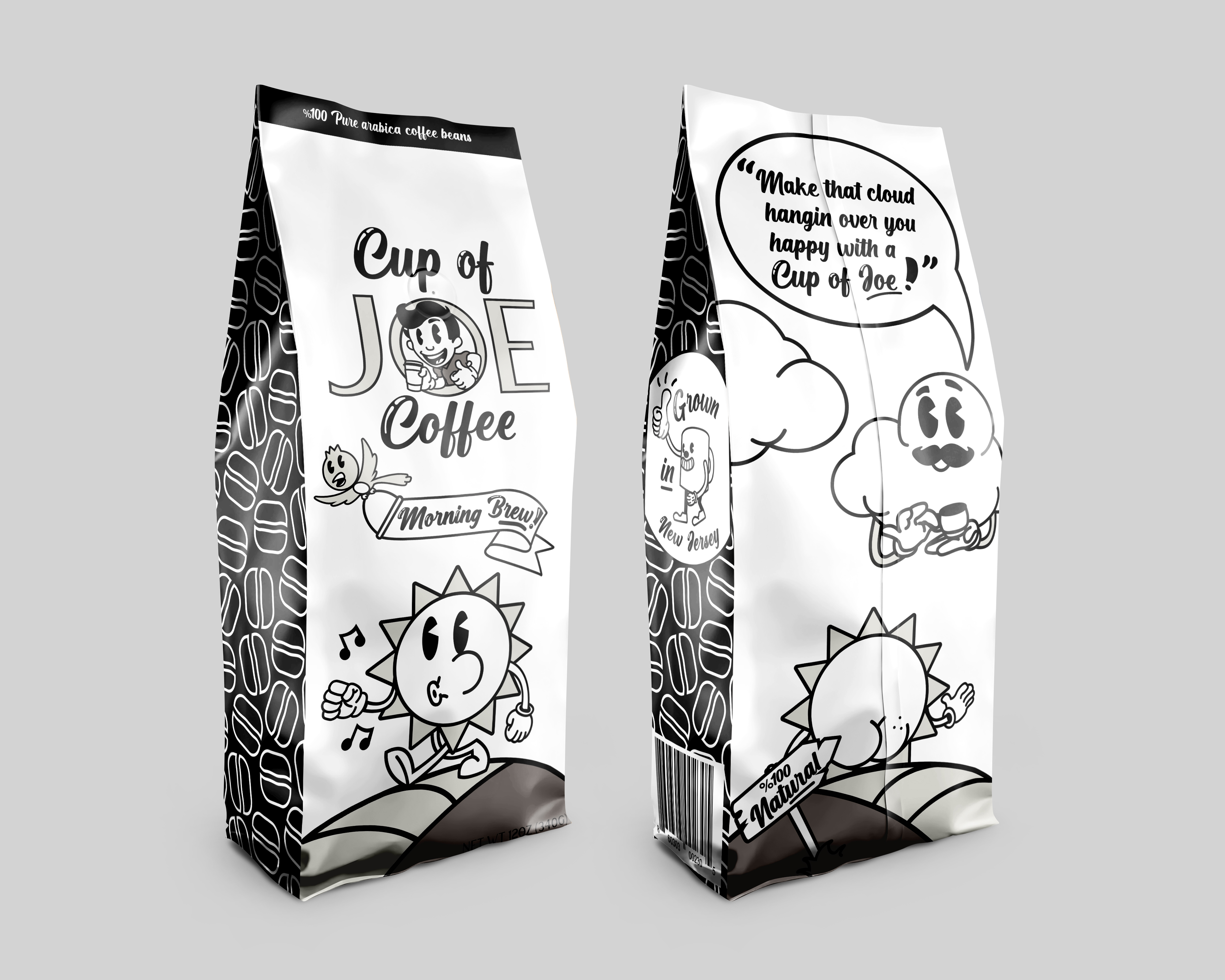 The packaging concept was designed specifically for coffee, inspired by my long-standing obsession with the drink itself. I wanted the visual personality of the brand to feel as rich and comforting as the coffee inside. What made this project especially rewarding was how it pushed me to think beyond the flat canvas of traditional graphic design. Translating my rubber hose illustrations onto a three-dimensional coffee bag meant every curve, fold, and angle had to be considered. The challenge wasn’t just creating engaging artwork—it was making sure that artwork could wrap, flex, and still tell a cohesive story across a physical, functional form. It taught me a lot about spatial design and how illustration can live and breathe on unconventional surfaces, not just screens or pages.